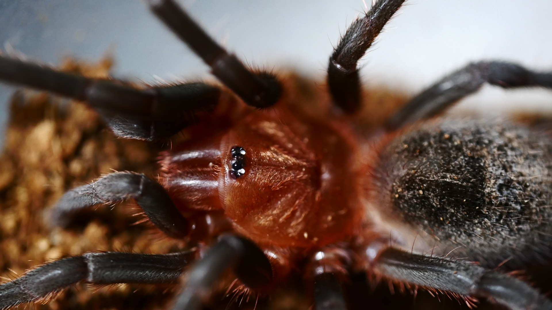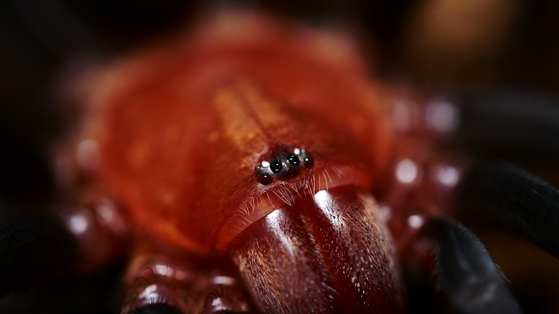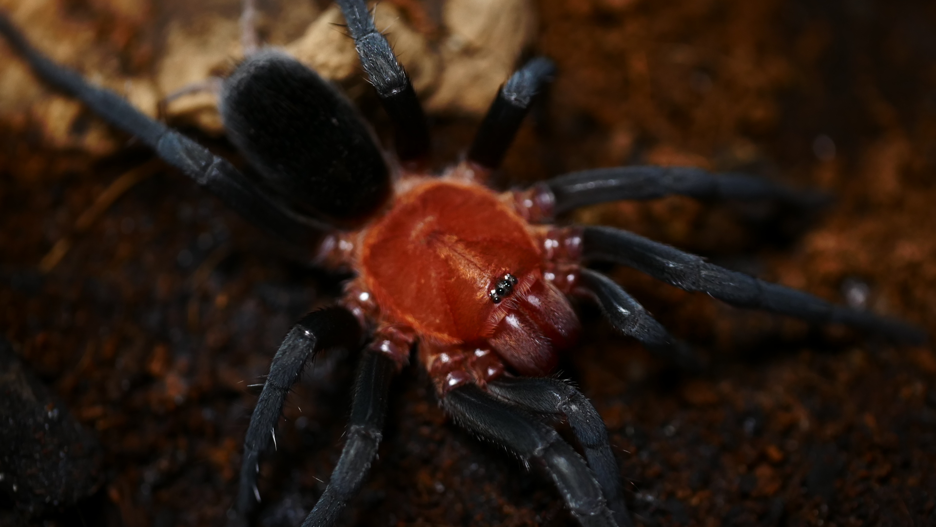 Aussehen: Die Tiere haben schwarze Beine und ein rot schwarzes Carapax(Vorderkörper), sowie ein schwarzes Abdomen(Hinterleib).